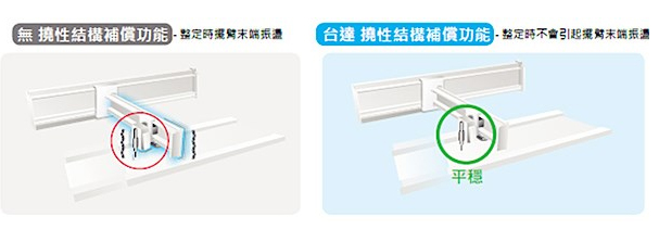 低頻擺蕩抑制 對高撓性機臺,有效抑制機構振蕩,提升運轉效能 主動式演算抑制法則,可避免末端機臺抖動,增快運轉速度