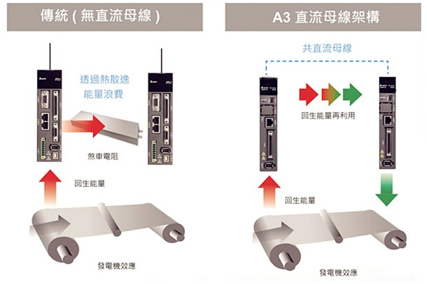 多軸共直流母線設計,保持直流母線電壓穩定,回生能量再利用,機械設備更節能